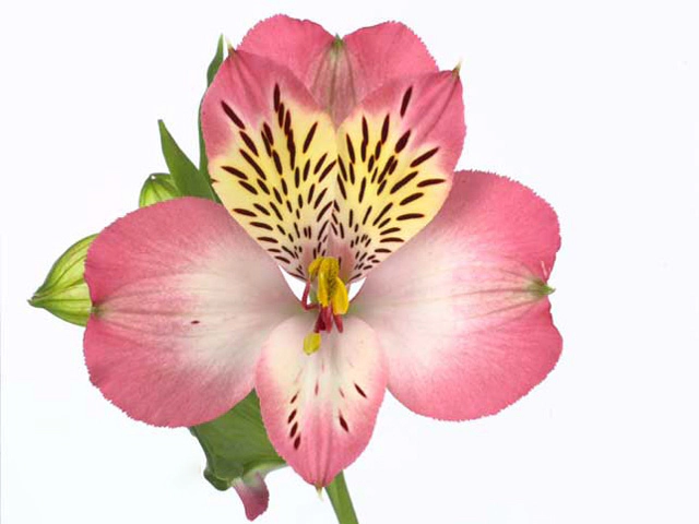 Листья данной альстромерии имеют ланцетную форму и удлиненную структуру. Основной цвет листьев - средне-зеленый, что создает контраст с белым и розово-голубым цветом цветков. Распределение цветка по краю превращает его в настоящее произведение искусства природы.