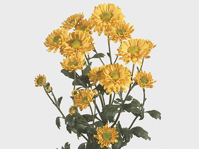 Хризантема индийская спрей "Danielle Brons" - это разновидность растения с одиночными желтыми цветками диаметром 5-5,5 см. Цветок окрашен в средне-желтый оттенок с оранжевым подтоном. Интересно, что данная хризантема имеет ракемозное соцветие, то есть цветки расположены на стебле в виде прикорневых листьев.