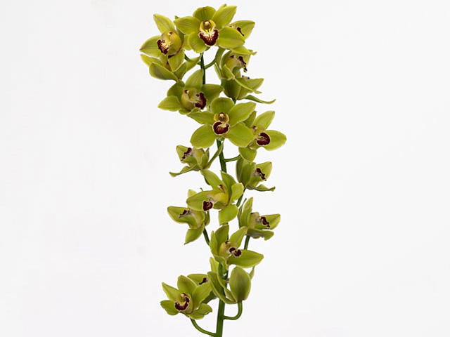 Цимбидиум крупноцветковый "Forest King" - это удивительное растение с крупными зелеными и светло-зелеными цветками диаметром от 10 до 11 см. Цветы собраны в соцветия формы колоса, что делает их особенно привлекательными. Вторичный цвет цветков - темно-пурпурный красный – придает им загадочности и таинственности.