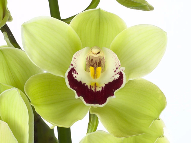 Цимбидиум крупноцветковый "Limones" - это удивительное растение с крупными, около 10-11 см в диаметре, зеленовато-светло-зелеными цветками. Это прекрасное растение отличается от других своим боковым цветком, который имеет красно-темно-пурпурный оттенок, а также зелеными полосами поблизости. Цветки собраны в соцветиях, образуя красивые рацимы, которые придают растению особую декоративность.