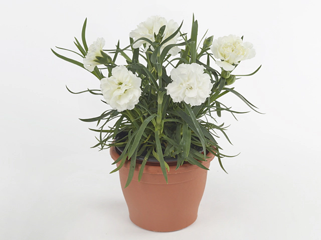 Гвоздика "Super Trouper Whitney" - это потрясающее растение с прекрасными цветами. Это многолетнее растение с дважды цветущими (pleniflorous) или полудвоичными (semi-double) цветками, которые имеют диаметр от 3,5 до 4 см. Цветы этой гвоздики имеют белый-белый оттенок с обочкой, которая может быть целой или зазубренной. Цветки распределяются равномерно, образуя однотонную цветовую гамму.