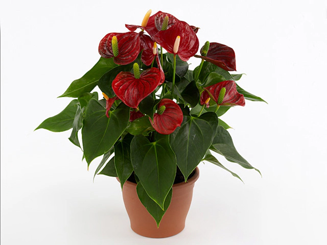The flowers of the Anthurium Piccolo have a diameter of approximately 8 to 8.5 cm, making them medium-sized blossoms that create a striking focal point. Their intense red color with shades of dark purple-red, coded as 046A, brings a burst of color to any room.