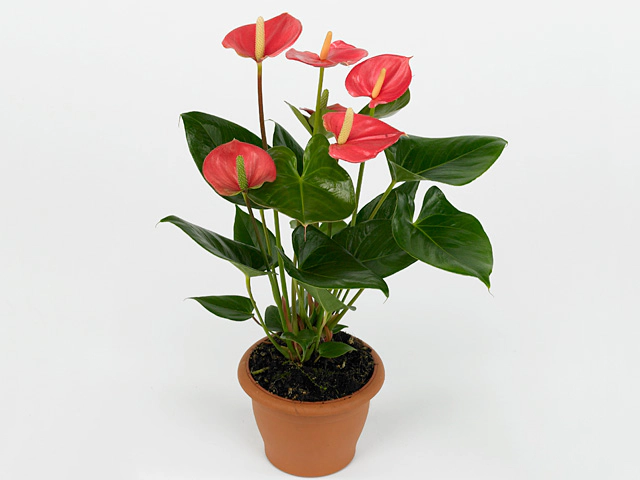 The Flamingo Plant features beautiful red-medium red pink flowers that measure around 6.5 to 7 centimeters in diameter. The flower color distribution is unicolored, creating a striking, uniform color palette. The flowers are borne on spadix and spathe inflorescences, which add an elegant touch to the overall appearance of the plant.