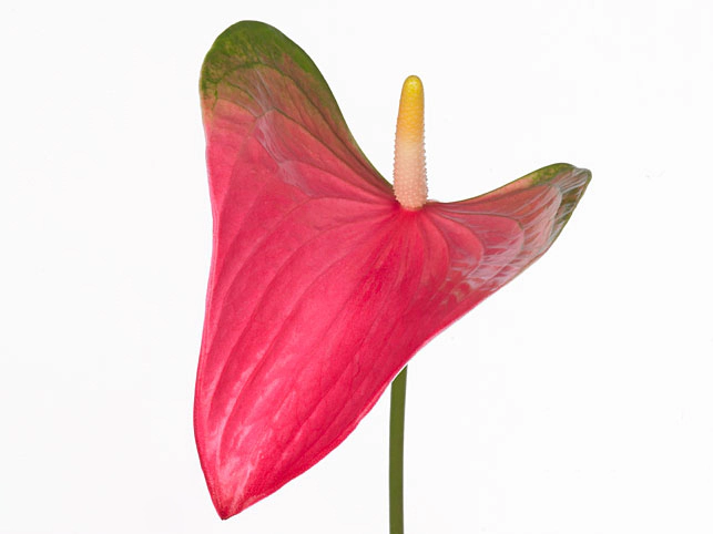 The Flamingo Plant stands out even more due to its bicolored flower distribution. While the primary color is a vibrant pink to medium red pink, it is beautifully complemented by secondary colors of dark green and brown, specifically green-dark brown green-146B. This blend of colors creates a visually striking contrast and adds depth to the overall appearance of the flower.