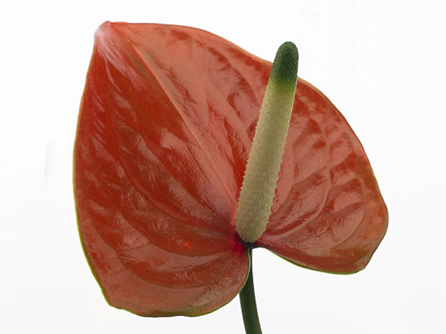 The flowers of the Anthurium Terracotta Leny are structured into inflorescences, consisting of a spadix and a spathe. The spadix is a long, slender stalk-like structure that stands upright, and it is covered in numerous tiny flowers. The spathe, on the other hand, is a modified leaf that wraps around the spadix, providing protection and support.