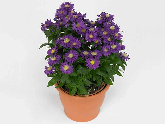 The flowers of the Aster Starletta Red are single in type, meaning they have only a single layer of petals. The flower color is a rich purple-dark violet shade (086A). The flowers have a diameter of 2.5 to 3 cm and are arranged in an inflorescence called a capitulum or head.