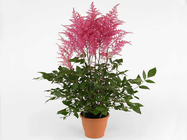 The diversely compound leaf division adds texture and interest to the plant, creating an overall captivating appearance. The inflorescence of Astilbe 'Aphrodite' can reach a length of 40-50 cm and a diameter of 20-25 cm, making it a prominent feature in any garden or flower arrangement. The dark green color of the main leaves contrasts beautifully with the unicolored distribution of the pink and dark blue-pink flowers.