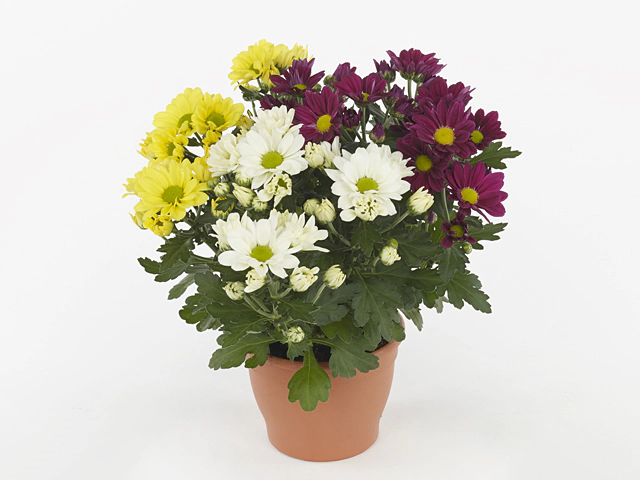 Chrysanthemum (Indicum Grp) Christy Daisy mixed in pot