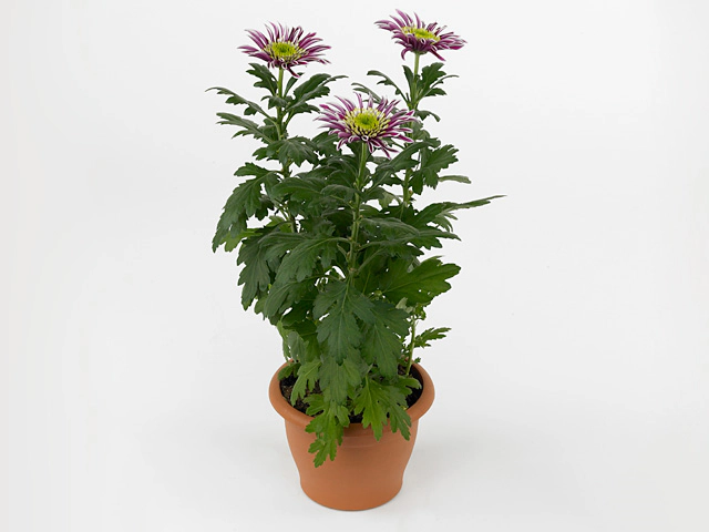 Whether showcased in a garden or used in floral arrangements, the Chrysanthemum Saba is a true garden gem. Its slightly doubled, bicolored flowers in white-white-NN155D and purple-dark purple-071A bring an air of elegance and sophistication to any landscape. Their large diameter, coupled with the plant's height and inflorescences, make for a breathtaking spectacle. With its divided and pinnatifid leaves in a rich dark green, the Chrysanthemum Saba is a truly captivating flower that is sure to mesmerize all who behold it.