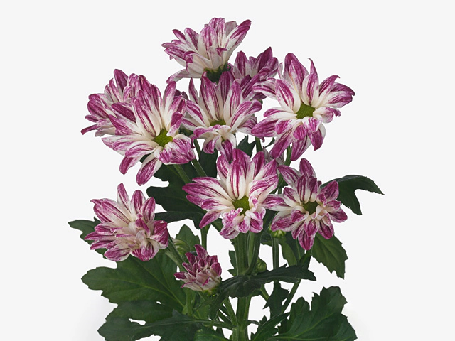 Overall, the Chrysanthemum (Indicum Grp) spray Flamboya is a captivating and distinctive variety. Its bicolored appearance, divided leaves, compact size, and feathered color distribution make it a standout choice for floral arrangements, gardens, or as a thoughtful gift to someone special. With its unique qualities, this chrysanthemum variety is sure to add a touch of elegance and beauty to any setting.