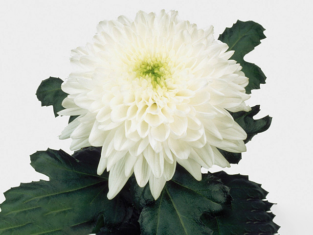 Chrysanthemum Indicum Grp, commonly known as 'Resolute', is a stunning plant that boasts beautiful white double flowers with a diameter of 10 to 11 cm. Known for its pointed or acute leaf tips, this chrysanthemum variety belongs to the foliage leaf type.