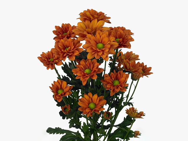 In conclusion, the Chrysanthemum (Indicum Grp) spray Marcato is a remarkable flower that offers a delightful combination of beauty and charm. With its slightly doubled flowers, mesmerizing orange-orange brown-N172C color, pinnatifid leaf division, unicolored distribution with a trace of brown-light brown-N172D, it is sure to captivate and bring joy wherever it is placed.