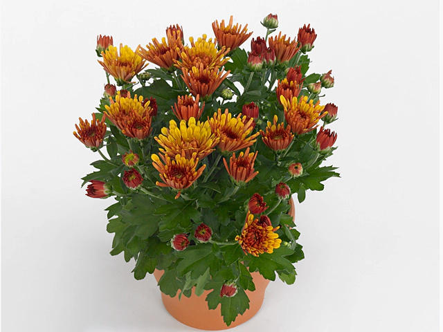 The Chrysanthemum (Indicum Grp) Blues is also known for its bicolored flower color distribution, with red-brown and yellow-dark yellow petals. This creates a stunning visual effect that is sure to catch the eye of anyone who sees it. Additionally, the flowers have secondary colors of brown-medium brown and brown-light brown, further enhancing the overall beauty and depth of the plant.