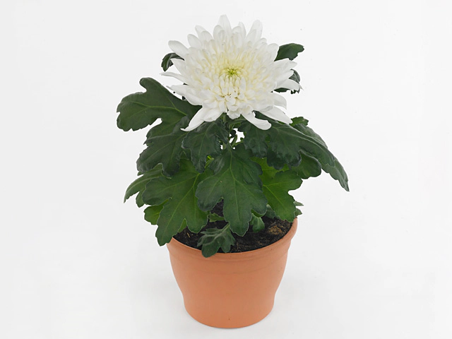 The foliage of this Chrysanthemum variety is equally enchanting. The leaves, which are divided/split in appearance, have a size ranging from 7.5 to 10 centimeters. The main color of the leaves is a rich dark green, providing an excellent contrast to the radiant white flowers.