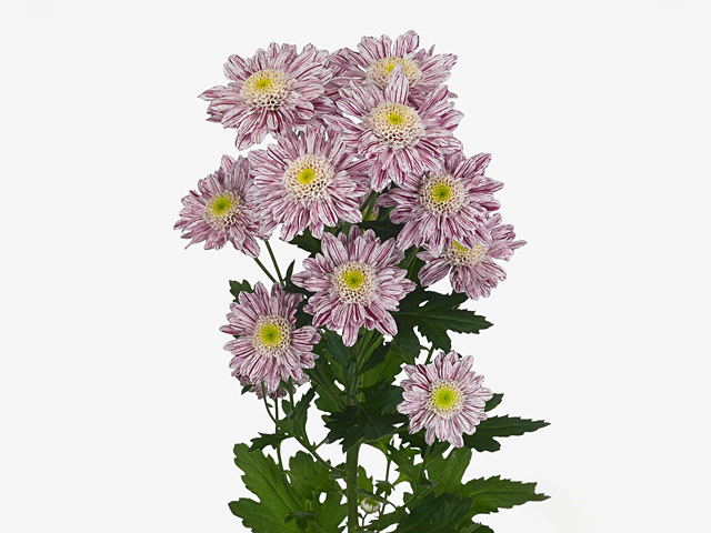 In conclusion, the Chrysanthemum (Indicum Grp) spray Serenity is a captivating flower variety that boasts semi-double blooms with a stunning purple-dark purple and white-white color combination. Its compact inflorescence and divided leaves further add to its appeal. Whether used in floral arrangements or as cut flowers, this variety brings an undeniable sense of serenity and beauty wherever it is displayed. With its striated color distribution, it is sure to leave a lasting impression on all who encounter it.