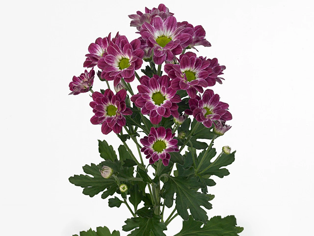 In conclusion, the Chrysanthemum (Indicum Grp) spray santini Savy is a magnificent flower variety that combines elegance and beauty. With its single flower type, bicolored distribution of purple-dark purple-071A and secondary color(s) in white-white-NN155A, it is a true visual delight. The divided/split leaves add an interesting texture to the overall appearance. Whether used in a garden or as part of a floral arrangement, the Chrysanthemum spray santini Savy is bound to leave a lasting impression with its vibrant colors and unique features.