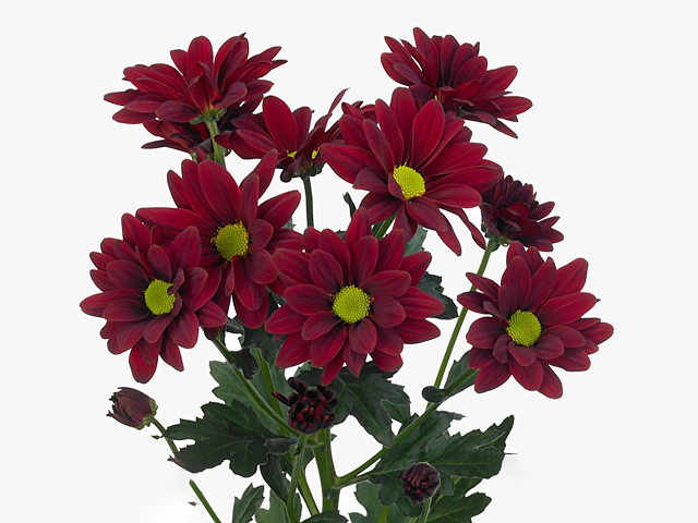 The Chrysanthemum Moretti, known for its stunning red-dark purple red flowers, is a popular spray variety from the Indicum Grp. It is highly sought after for its single-petaled blossoms, each with a diameter of 7 to 7.5 cm. The inflorescence of this chrysanthemum is in the form of a capitulum or a head, consisting of numerous flower buds.