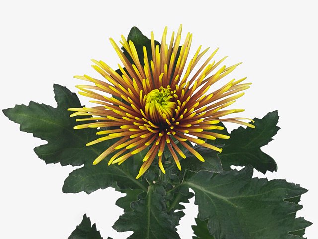 In summary, Chrysanthemum (Indicum Grp) disbudded Chispa is a stunning flower variety with double, bicolored flowers. The combination of yellow, medium yellow, and brown adds depth and visual interest, while the single-flowered inflorescence and divided leaves contribute to its overall elegance. Chispa is a must-have for any garden or floral display, adding vibrancy and intrigue to the surrounding environment.