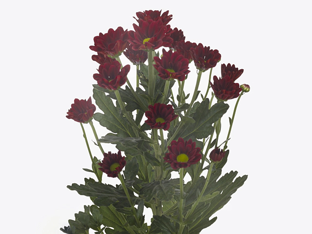 In terms of foliage, the Chrysanthemum spray santini Fenix has divided or split leaves, adding another layer of visual interest. The leaves provide a lush and full backdrop to the striking flowers, enhancing their beauty even further.