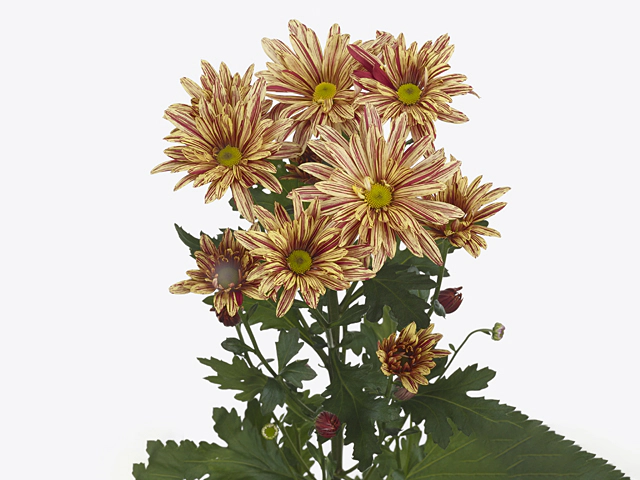In conclusion, the Stellini Yellow spray chrysanthemum is a remarkable flower that effortlessly captures attention. Its single-flower type, with a color palette that ranges from yellow to dark brown-purple, combined with a generous diameter, inflorescence variations, pinnately lobed leaves, and striate, bicolored petals, make it an excellent choice for those seeking a visually striking addition to their floral arrangements or gardens.