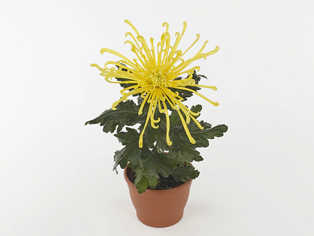 As for the flower color distribution, the Chrysanthemum Fireworks Yellow showcases a uniform and consistent unicolored display. The entire flower is suffused with the captivating shade of yellow, ensuring a vivid and dramatic look from every angle.
