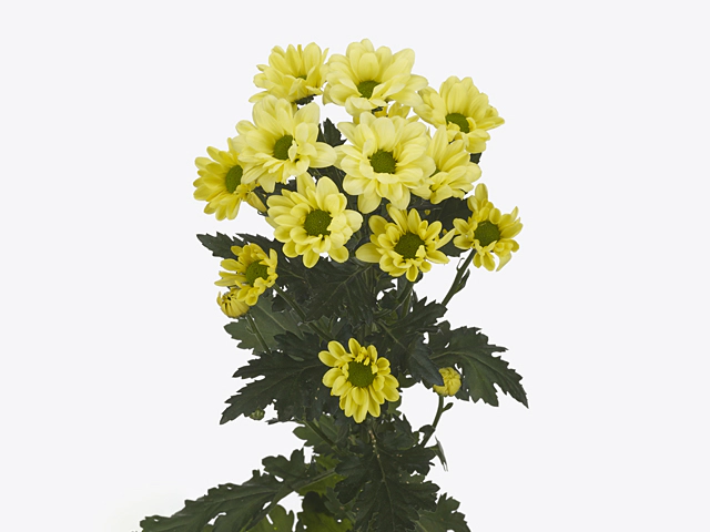 Unlike some chrysanthemum varieties with multi-colored petals, the Chrysanthemum tros Chic Cream flaunts a unicolored appearance. The entire flower, from its center to the outermost petals, maintains a consistent yellow hue. This uniform color distribution reinforces the simplicity and elegance of this cultivar.