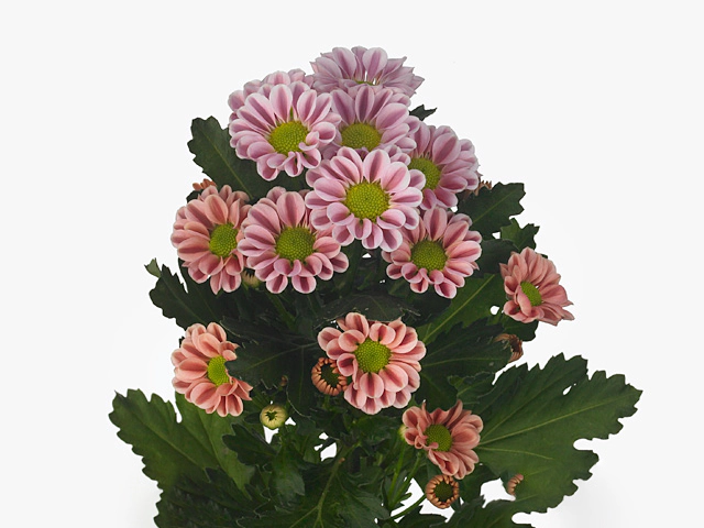 The flower color of the Chrysanthemum spray santini Kim is a mesmerizing blend of pink and light blue. The combination of these delicate hues creates a stunning visual appeal that is sure to catch the eye. The specific shade is identified as pink-light blue pink-075D, adding a touch of uniqueness to this variety.