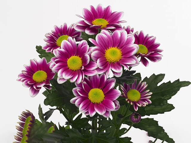 As for the leaves of Chrysanthemum Timman, they are pinnatifid, meaning they have deeply incised lobes. This leaf division adds an interesting texture and shape to the plant, complementing the blooms' beauty. The main color of the leaves is a dark shade of green, which provides a striking contrast against the vibrant purple-medium violet flowers.