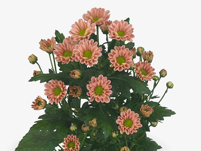 In conclusion, the Chrysanthemum (Indicum Grp) spray santini Rossi Smokey is a remarkable chrysanthemum variety. Its single flowers with a pink-light red color and a flower diameter of 2.5 to 3 cm make for a visually appealing display. The inflorescence, either in the form of a capitulum or raceme, adds to its charm. With its pinnatifid leaf division and unicolored flower color distribution, this chrysanthemum variety is sure to capture attention and bring a touch of elegance to any garden or floral arrangement.