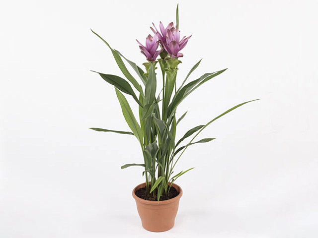 Measuring approximately 9-9.5 cm in diameter, the flowers form an eye-catching inflorescence known as a spike. The spike is a cluster of multiple blooms that rise above the rest of the plant, commanding attention with their vibrant colors and unique form. This inflorescence further enhances the aesthetic appeal of the Curcuma Siam Samba, making it a perfect choice for flower enthusiasts and horticulturists alike.