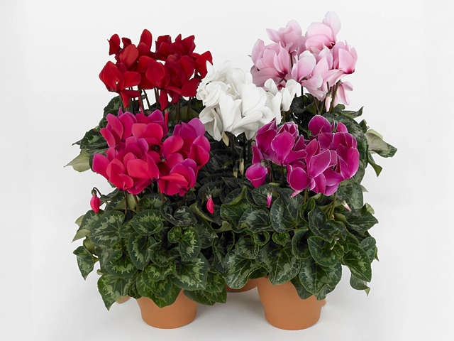 Cyclamen persicum large flowered Sierra Synchro, also known as Alpine Violet or Cyclamen, is a beautiful plant that boasts a variety of features. The flower colors of this cyclamen are mixed, creating a vibrant and eye-catching display. The leaves of the plant are heart-shaped, or cordate, adding to its charm.