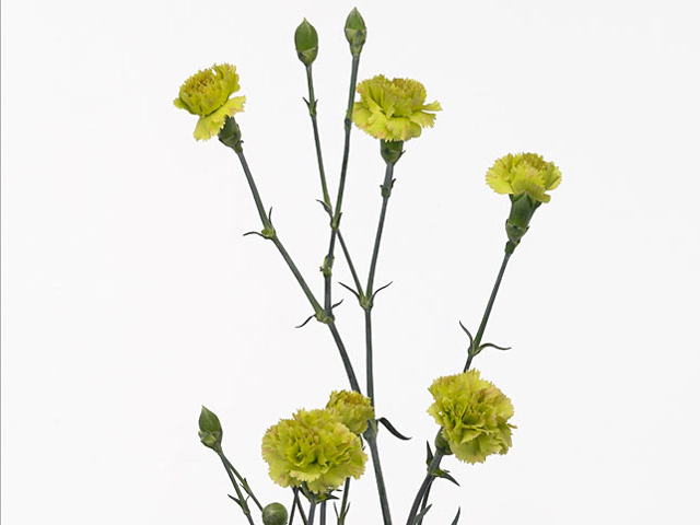 Introducing the Dianthus Spray Green Peace, a magnificent variety of Dianthus also known as Carnation. The Green Peace Dianthus features stunning flower color that ranges from a vibrant medium yellow green to a captivating shade designated as 150B on the color spectrum. With a diameter of 4 to 4.5 cm, these flowers are compact yet don't compromise on their enchanting beauty.