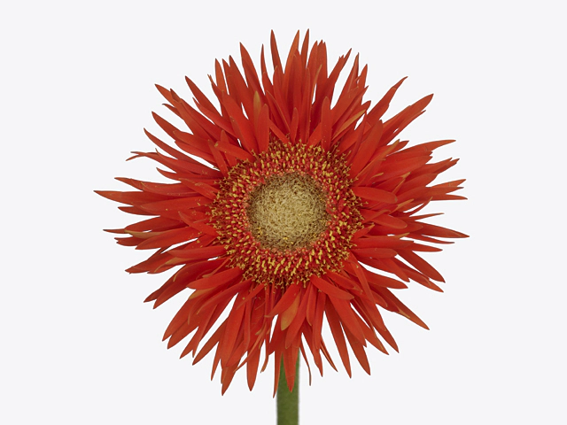 While some flowers exhibit a multicolored appearance, the Gerbera mini spider shaped Rustu carries a unicolored distribution of its vibrant hue. This means that the entire flower is adorned in the same intense orange-orange red color, creating a cohesive and harmonious look. The uniformity of the color adds to the overall allure and impact of this exceptional flower.