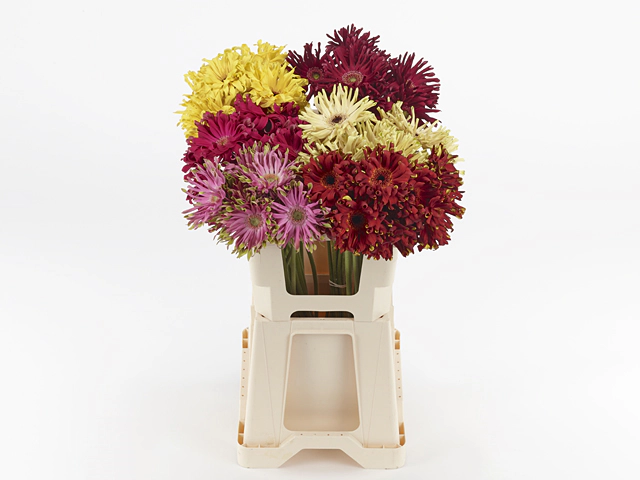 The Gerbera large flowered curl-shaped Pastini mixed in pan is suitable for a variety of uses. Whether used in floral arrangements, bouquets, or as a centerpiece, this flower's striking features are sure to catch everyone's eye. Its mix of colors adds a touch of excitement and liveliness to any space it graces.
