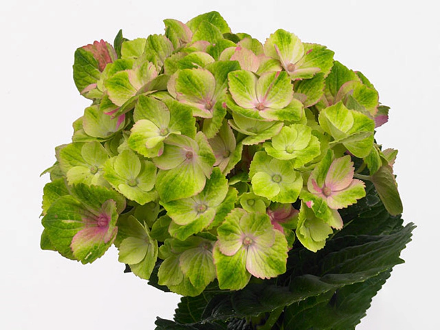 The leaves of this hydrangea variety are large, ranging between 10 and 15 centimeters in size. Their main color is a lush dark green, providing a striking contrast to the green flowers.