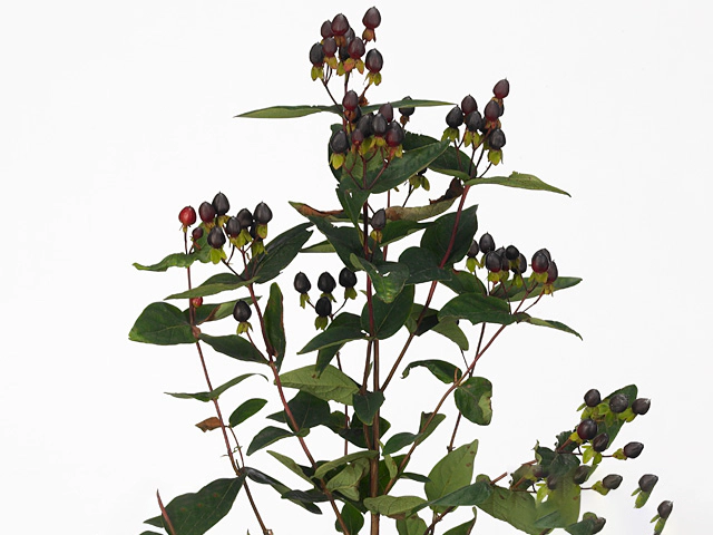 Hypericum x inodorum Magical Universe, commonly known as Tutsan or St. John's Wort, is a stunning plant with several distinguishing features. One of its most notable characteristics is its berry-like fruit, which is cone-shaped and ranges in color from a vibrant red to a dark purple-red hue.