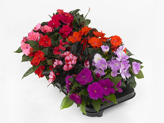 Impatiens (New Guinea Grp) Clockwork mixed, also known as Balsam, is a delightful flower that is sure to add a pop of color to any garden or landscape. With its single flower type and mixed colors, it is a versatile and eye-catching plant that will surely captivate anyone who sees it.