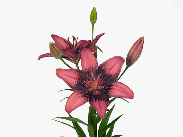 The Lilium (Asiatic Group) Lat Pink, also known as the Lily, is a stunning flower that displays a beautiful combination of pink and medium brown purple colors. Additionally, there are variations within the species that showcase a mix of red and dark purple red hues. These vibrant colors make the Lily an eye-catching addition to any garden or floral arrangement.