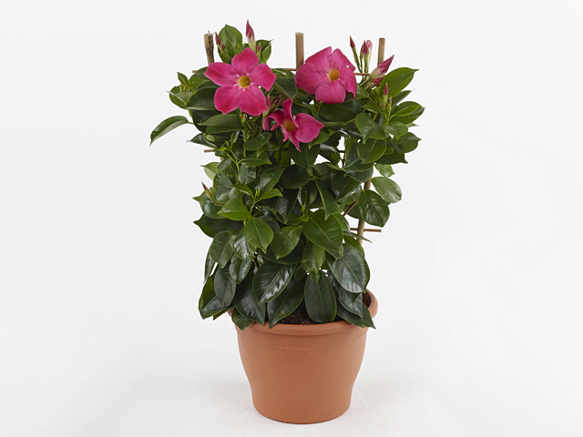 Speaking of flowers, the Mandevilla Bella Pink produces single-type blooms. These flowers have a diameter of 7-7.5 cm and a length or height of 5.5-6 cm. The flower color is a captivating pink-medium purple red, with a uniform distribution of color.