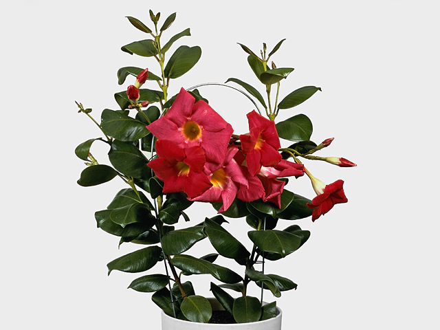 Mandevilla sp., also known as Mandevilla, is a beautiful flowering plant that belongs to the family Apocynaceae. This tropical vine is renowned for its luscious red to dark red flowers and glossy dark green leaves. With its stunning appearance, Mandevilla attracts attention and adds a touch of elegance to any garden or indoor space.