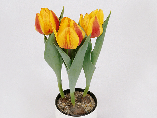 In conclusion, the Tulipa (Single Early Group) 'Flair' is a visually striking tulip variety with its bicolored petals in yellow and red, and delicate feathered patterns. The green-grey leaves provide a beautiful backdrop for the stunning blooms, making this tulip a true standout. Whether planted in the ground or used in floral arrangements, the 'Flair' tulip is guaranteed to add a touch of elegance and beauty.