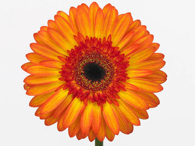 Интересной особенностью этой герберы является ее бицветность и наличие перехода от одного цвета к другому вдоль краев лепестков. Также на лепестках присутствует переходной цвет, который придает цветку особую изюминку.