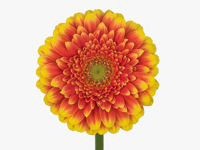 Гербера мини "Franky" - это растение с полумахровыми красно-светлокрасными и желто-средне-желтыми цветками. Диаметр цветка составляет 7 - 7,5 см. Инфлоресценция состоит из головки, а цветки распределяются по краям и имеют двухцветное окрас.
