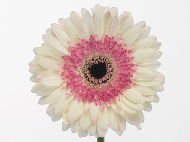Гербера крупноцветковая "Shimmer" - это прекрасное растение, которое обязательно привлечет внимание своей красотой. Она отличается крупными полу-двойными цветками, диаметр которых достигает 10-11 см. Цветы имеют шикарное биколорное окрас, включающий в себя белый основной цвет и розово-фиолетово-красный вторичный цвет. Такая игра цветов создает неповторимый и яркий вид цветка.