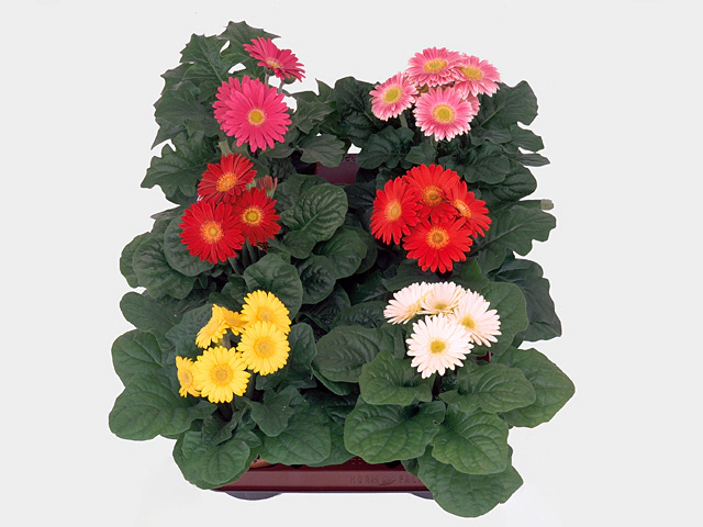 Листья герберы "Hummingbird" темно-зеленые, сочные и блестящие, что создает прекрасный контраст с яркими цветками. Растение достигает высоты около 30-40 см и имеет пышную, сросло-розеточную форму, что делает его идеальным для контейнерного выращивания или для украшения цветочных клумб.