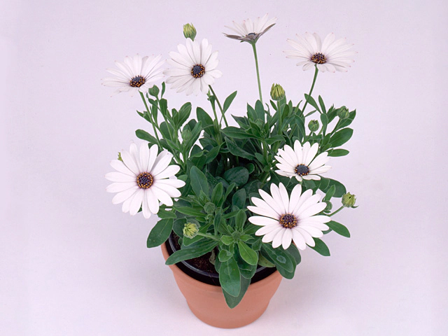 Остеоспермум "Margarita Maria" – это невероятное растение с одним крупным цветком, окруженным зубчатыми листьями. Его цвет – белый с легким зеленым оттенком, что делает его невероятно свежим и нежным. Цветки имеют диаметр от 5 до 5,5 см, поэтому они заметны издалека.