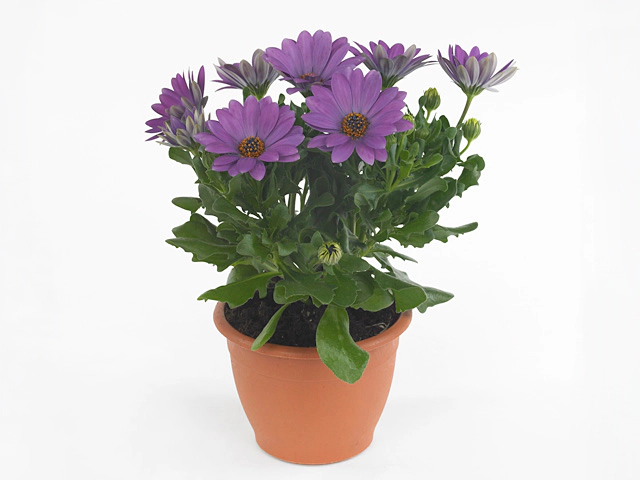 Остеоспермум "Sunny Electra" - это прекрасное растение с крупными яркими цветками. Его цветки имеют средне-фиолетовый оттенок, а их диаметр составляет от 4,5 до 5 см. Одиночные цветки собраны в соцветия-корзинки, что делает растение особенно декоративным. Высота растения может достигать от 20 до 30 см, при этом его листья имеют темно-зеленый цвет и продолговатую форму. Размер листьев составляет от 4 до 5 см. Края листьев зубчатые и лопастные.