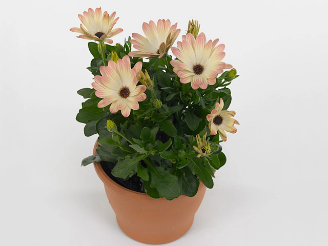 Цветы данного сорта отличаются моно-, а также двухцветной окраской. В зависимости от сорта остеоспермума "Dalina Evita" вы сможете увидеть цветы в оттенках светло-желтого, розово-коричневого и других интересных цветовых сочетаний. Диаметр цветка составляет от 5,5 до 6 см, что делает их заметными и привлекательными.