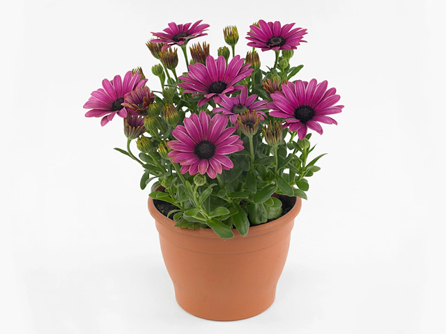 Остеоспермум "Sunny Classic Bacia" - это замечательное растение, которое поражает своим красивым внешним видом и обильным цветением. Его одинарные соцветия имеют диаметр от 6 до 6,5 см, что делает его цветы одними из самых крупных среди растений этого вида. Цветки имеют умеренно фиолетовый оттенок, с легкими следами другого цвета - белого.