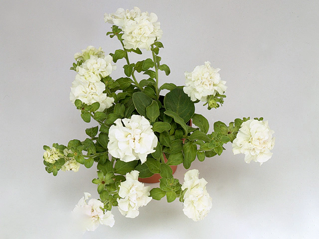 Петуния "Surfinia Double White" - это очаровательное растение с двойными цветками, которые окрашены в чистый белый цвет (по шкале цветовой гаммы 155C). Ее листья имеют эллиптическую или овальную форму и темно-зеленый оттенок. Диаметр цветка составляет 6 - 6,5 см, а цветки располагаются по одному на каждом цветоносе.